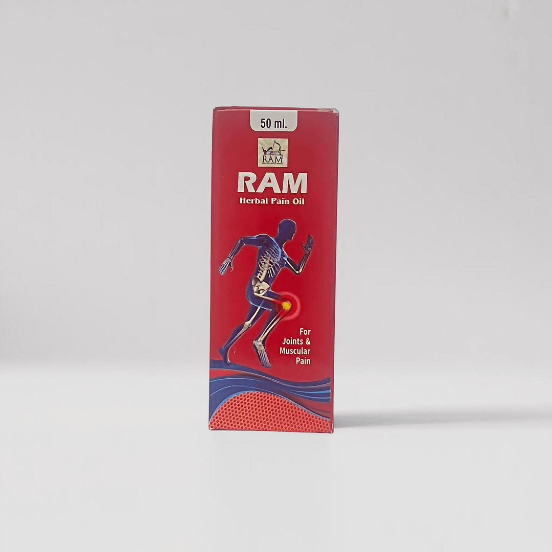 RAM Herbal Pain Oil is a natural ayurvedic solution for joint and muscular pain relief. Fast-absorbing, non-sticky, and effective for stiffness, arthritis, and muscular aches.